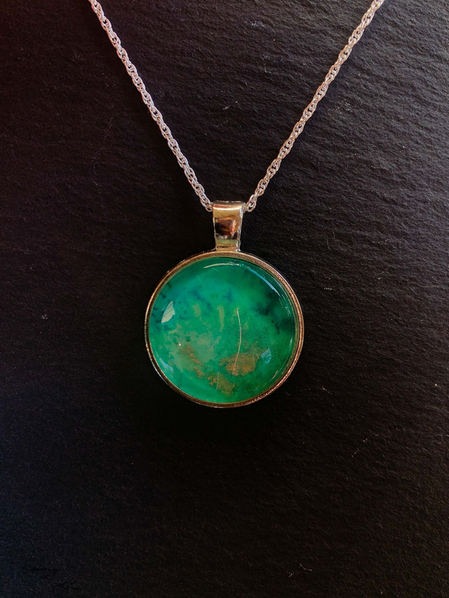 Peinture aquarelle et acrylique sur papier d'art hahnemühle 265g/m2 encapsulé dans un support médaillon en alliage de métaux, cabochon en verre transparent haute qualité