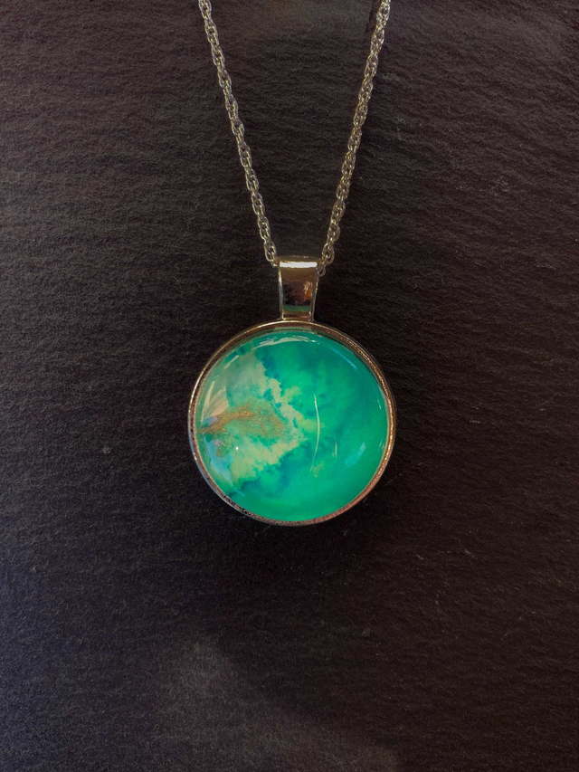 Peinture aquarelle et acrylique sur papier d'art hahnemühle 265g/m2 encapsulé dans un support médaillon en alliage de métaux, cabochon en verre transparent haute qualité