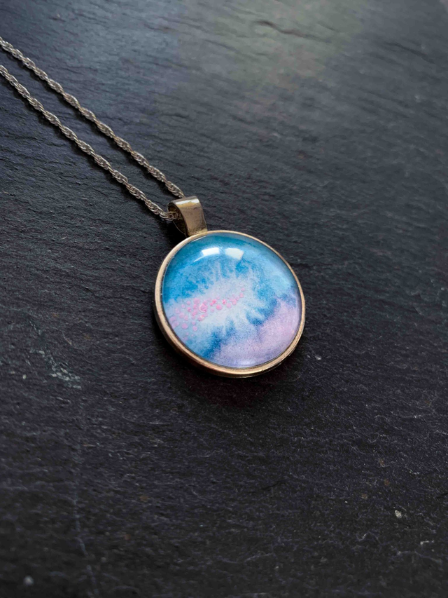 Peinture aquarelle et acrylique sur papier d'art hahnemühle 265g/m2 encapsulé dans un support médaillon en alliage de métaux, cabochon en verre transparent haute qualité