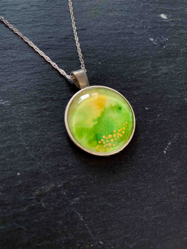 Peinture aquarelle et acrylique sur papier d'art hahnemühle 265g/m2 encapsulé dans un support médaillon en alliage de métaux, cabochon en verre transparent haute qualité